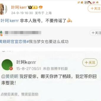 #叶珂否认多年前公开示爱黄晓明# 有网传截图显示,网名中含“叶珂”的账号在2015年在社交媒体发文,包含各种对黄晓明表示爱慕的内容,19日,叶珂发文辟谣:非本人账号,不要传谣了。